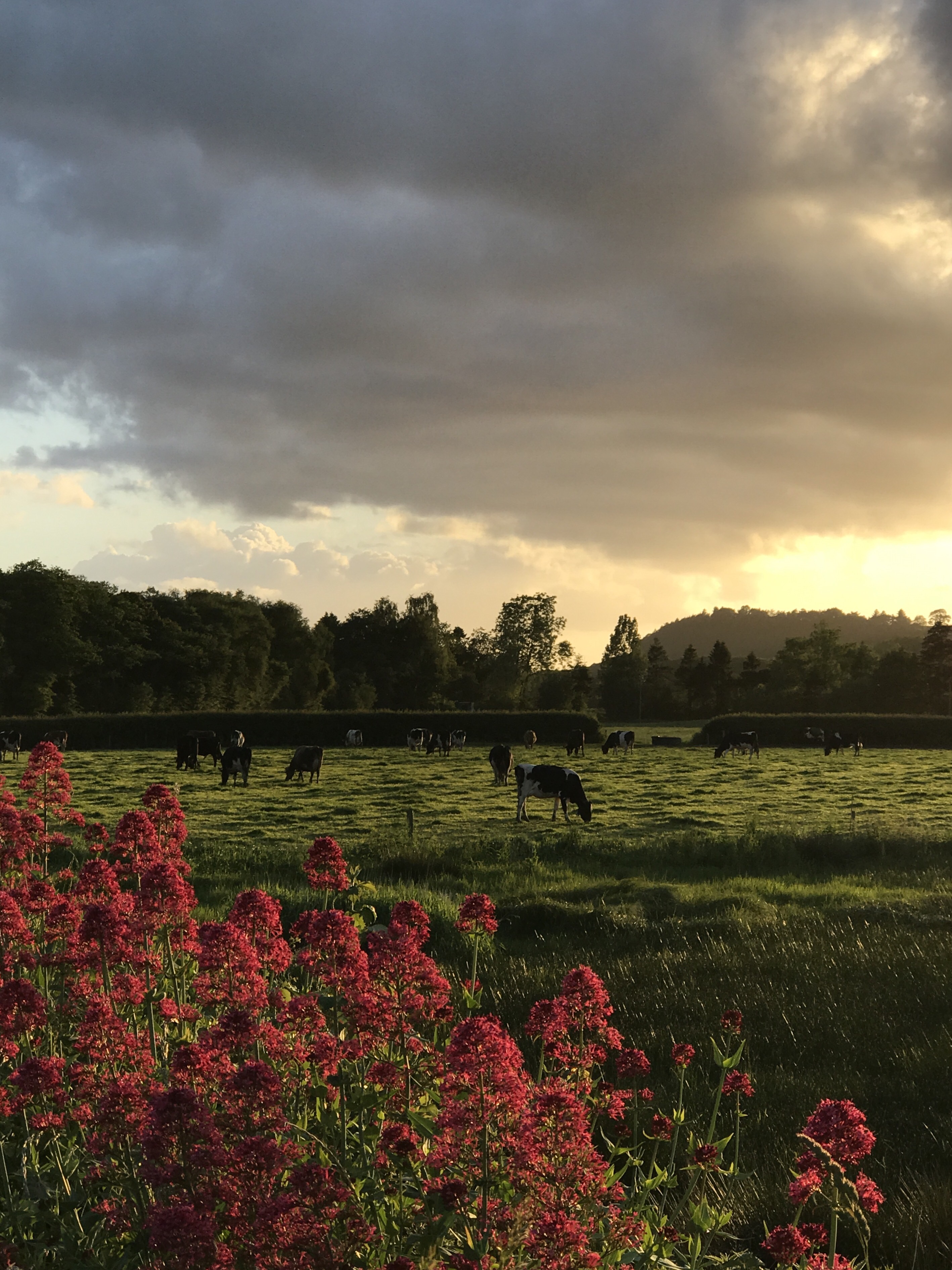 I am in bed still, which seems like a total indulgence (it is! And I’m proud of it!) on this Sunday morning. I woke fairly early and there was some sun, so I opened the curtains and the 180 year old window and listened to the birdsong and distant cow bellows. I can see hedgerows, trees, pastures and hills and for some quirky reason a disused, lopsided old red telephone box in the foreground. Over the past hour the birdsong has been steadily drowned out by the soft, cool rain that is pattering on all the foliage and the distant view is disappearing as the rain, although light, creates a mist in the valley.