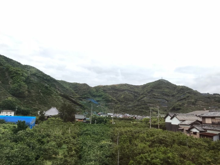 The train journey was by far one of the most extraordinary I’ve ever taken. I know I’m no guy in seat 61 or Michael Portillo but I love my train travel and I have had some amazing train journeys over the years. I had to wonder if they knew about it. If you’re ever in Japan, do yourself a favour… First of all you’ll get the total Japanese train experience which is a wonder to behold (conductors in white gloves and crisp blue uniforms, precision timetabling, queuing behaviour which is close to “being on the spectrum”) but then so much more. The scenery was rather spectacular; undulating mountains covered in native forest of varying colours, terraced apple groves, rice paddies with the perfectly placed crane, rushing rivers ripe for rafting and then, to top it off, the ocean, the Pacific, with islands, and surfers, and waves and headlands. Kapow!! Also you can mix into all of that tiny glimpses of rural Japanese life; the escaped flowering wisteria on the edge of the forest, the market gardens, the bent-over farmer returning to her home pushing a small cart, and the architecture particular to homes, especially the specifically pitched black tile roofs.