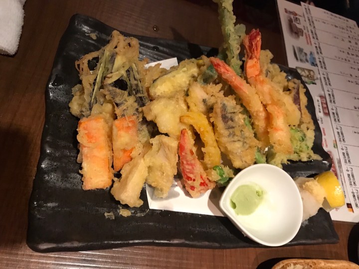 The saké and the conversation flowed. It was a great relief to us that Kana could do the ordering, and that she did with aplomb. We had the most amazing selection of sashimi beautifully presented (I hark back to the Osaka sashimi experience – not even close in style and quality!) and some equally delicious tempura and fresh broad beans.